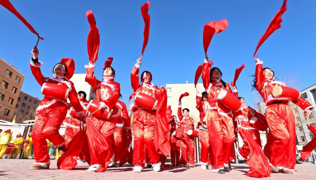 Local Shehuo troupe rehearses waist drum dance in Shahe town, Linze county, Zhangye city, Gansu province, on Jan 28, 2024. [Photo provided to gogansu.com]
