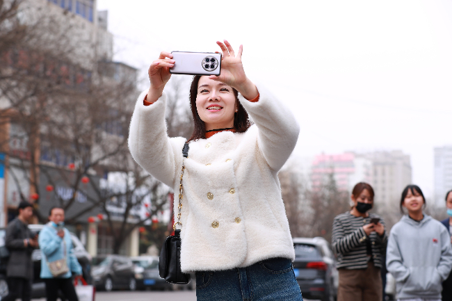 Tourists enjoy the vibrant atmosphere in Tianshui, Gansu province, on March 16, 2024 and snap them on their cameras. [Photo provided to gogansu.com]
