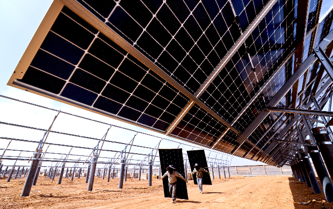 Construction workers are transporting photovoltaic panels, preparing for installation at a site in Banqiao town, Linze county, Zhangye, Gansu province, on April 15, 2024. [Photo provided to gogansu.com]