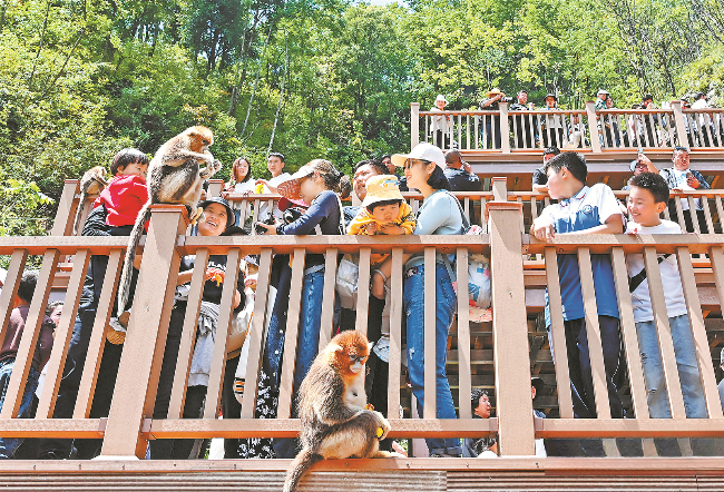 Tourists have close encounters with golden snub-nosed monkeys in Yuhe town, Wudu district, Longnan, Gansu. [Photo provided to gogansu.com]